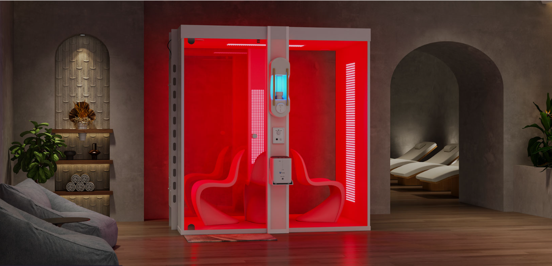 Recovery room with red light therapy, massage chairs, compression boots, and more